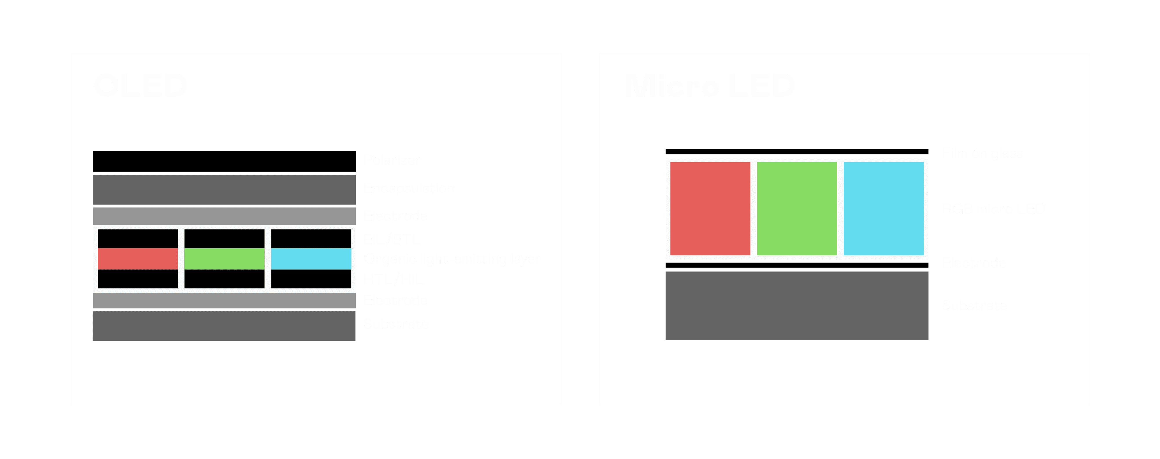 以 LED 做为显示画素,,可让 LED 的发光效率发挥到极致,,,从而让显示器具备优异的亮度表现,,,,不论是在户外或室内,,,,均具备出众的显示效果。。。同时,,与使用有机材料的 OLED 相比,,LED 具备更稳定、、寿命更长的特性,,,不仅不会有画面烙印问题,,,而且更不容易出现故障、、、坏点。。。。