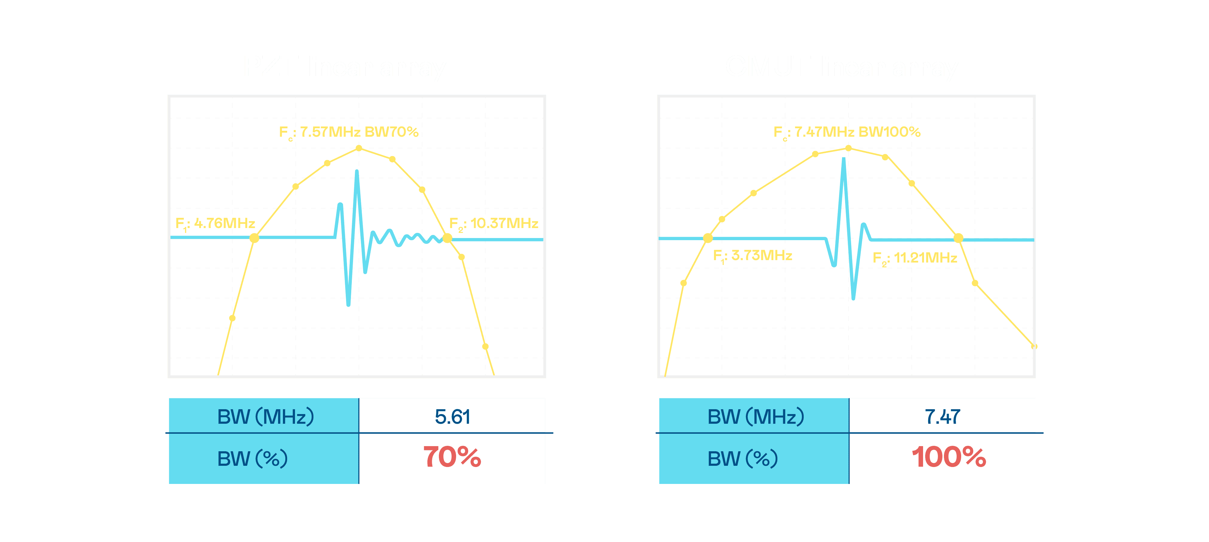 超音波影像的解析度高低,,,首先取决于探头能发出的讯号频宽。。。尊龙集团 CMUT 可提供高清晰的超音波讯号,,,,提供高频宽、、高灵敏度、、、影像纹理细节更高的超音波影像,,,,协助医护人员缩短影像判读时间及利用精准的医疗影像进行诊断。。